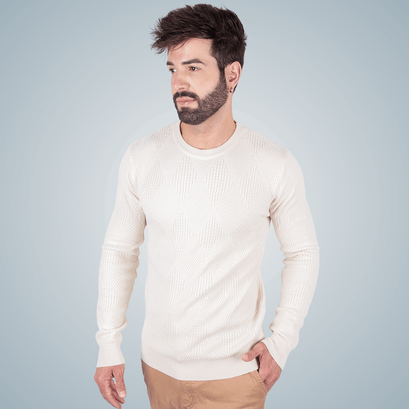 O trabalho em alto e baixo relevo na malha desenha traços geométricos em forma de losangos na parte frontal da peça, enquanto a textura de malha lisa nas costas e mangas equilibra a estética discreta do modelo. Os punhos das mangas e a barra são finalizados em barra canelada, essencial para o caimento perfeito e ajuste adequado ao corpo.