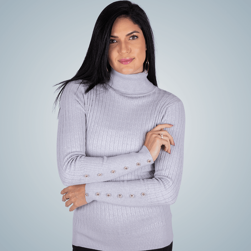 Indicada para ser a protagonista dos melhores looks invernais, este modelo de blusa feminina de inverno é surpreendentemente delicada. A textura romântica das trancinhas do tricô, aliado ao charme da gola alta dobrada, valorizam o look final com o detalhe de botões com strass nos punhos da manga.