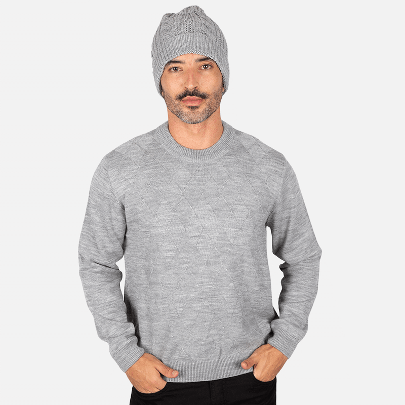 Blusa de inverno masculina em tricô elaborada com fios de lã de alta espessura, ideal para uso interno em dias de frio intenso. O decote careca é um diferencial significativo, pois o acabamento em malha canelada, rente ao pescoço, reduz significativamente a perda de calor corporal.