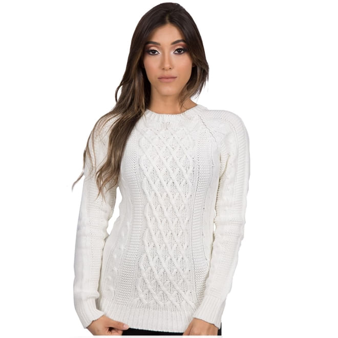 Blusa de inverno feminina produzida em malha lisa de tricô em fundo preto em composição e delineando as mangas e a frente do modelo.