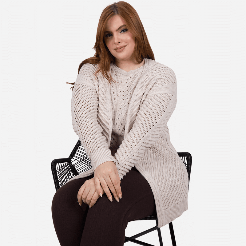 Um cardigan feminino luxuoso e exclusivo, perfeito para quem ama tricô com charme artesanal. Com pontos texturizados que variam entre tramas abertas e mais compactas, ele adiciona glamour e sofisticação às suas produções. A trama vazada, inspirada no trabalho manual, combina entrelaçamentos fechados nas laterais e acabamentos, e mais abertos no corpo, criando um design exclusivo.
