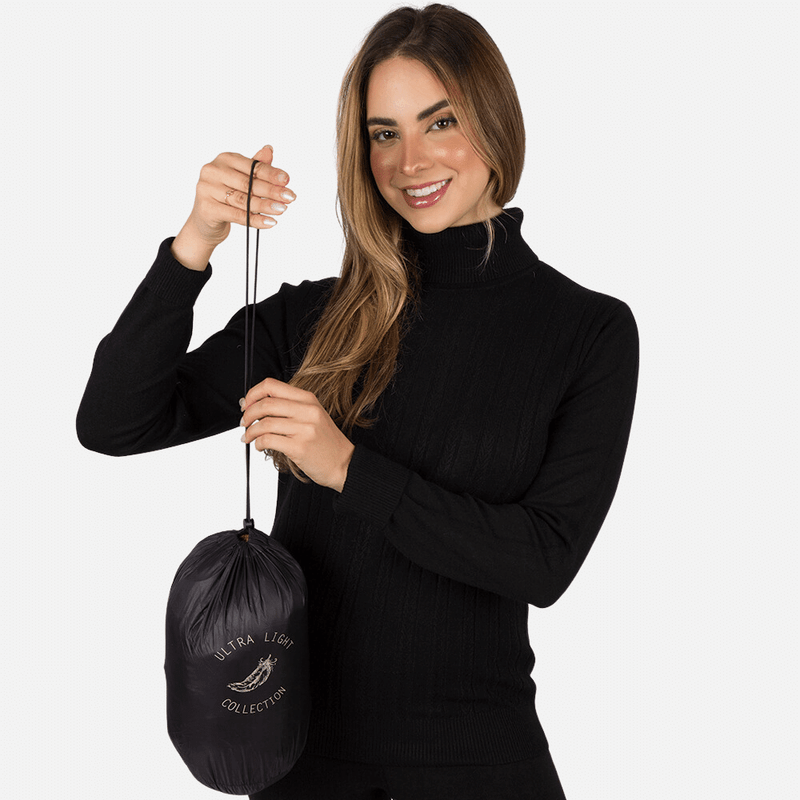 Produzido com revestimento interno em plumas de aves aquáticas, oferece alta capacidade térmica com pouco volume e quase nenhum peso. O tecido externo em nylon oferece ótima resistência ao vento, além de ser prático, durável e compacto. O casaco todo cabe em uma bolsinha que acompanha a peça.