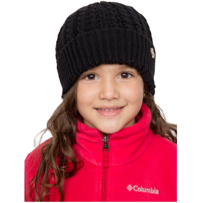 Gorro de inverno produzido em malha de tricô com desenhos em alto relevo de tranças e barra dobrada canelada na parte inferior.