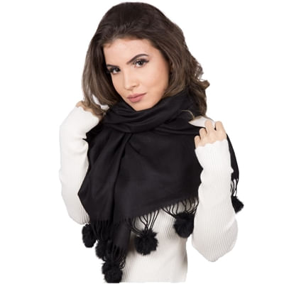 Manta é um acessório que oferece muito charme ao look feminino nos dias frios. O comprimento deste modelo é ideal para proteger e aquecer o colo, ombros e toda a região do pescoço quando a temperatura baixar. Esta manta tem um design especialmente sofisticado onde agrega o acabamento das bordas inferiores com franjas a delicados pompons em pelo sintético nas pontas, oferecendo, assim, um visual diferenciado, bonito e estiloso.