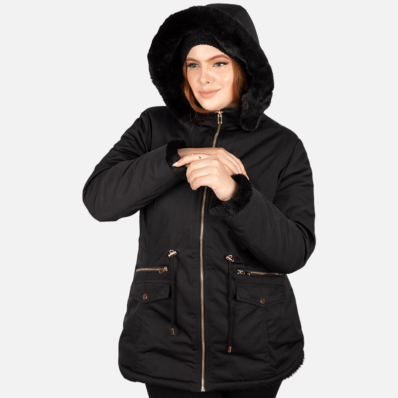 O capuz desta peça é especial! Além de proteger a área da cabeça e as orelhas, dispensando o uso do gorro em alguns casos, este item traz um toque bem charmoso. Também forrado em pelúcia e envolto de pelos, ele é ajustável e removível. Logo, você pode adaptá-lo ao seu próprio gosto e criar visuais diferentes, com e sem o capuz.