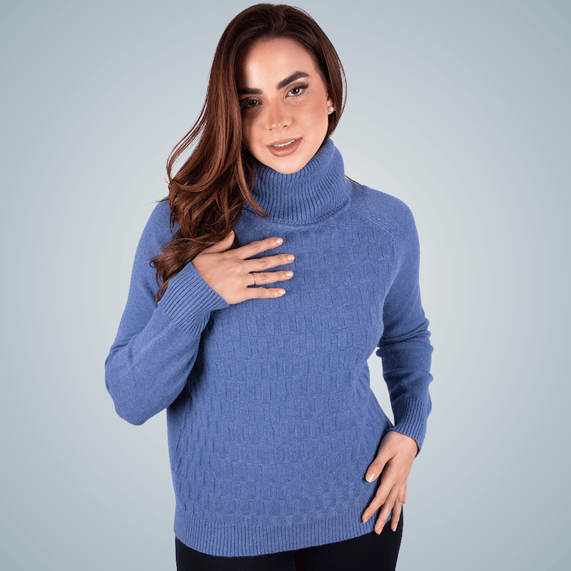 A charmosa gola alta e dobrada deste modelo enfatiza o charme do inverno. Com modelagem mais ampla, reta e mangas de corte raglã, a textura incomparável da malha em modal com viscose, é altamente respirável, durável e os relevos geométricos na parte frontal esbanjam charme nas cores mais belas!