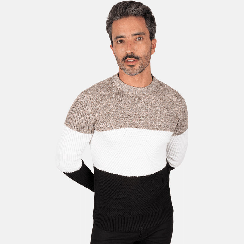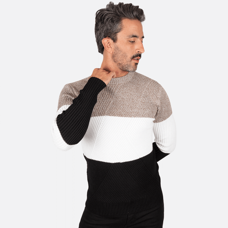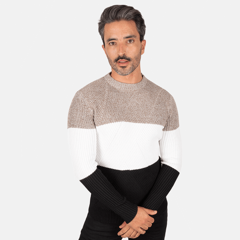 Pullover de inverno masculino produzido em frio de tricô canelado de alta espessura e textura em alto relevo. Design marcante enfocando o contraste das três cores, modelagem slim com acabamento de decote careca rente.