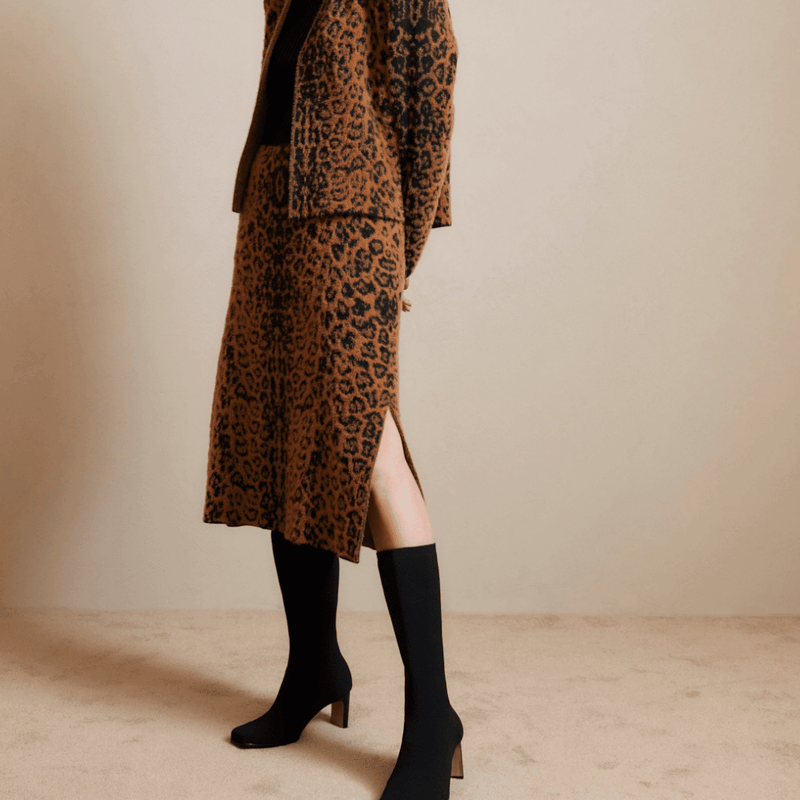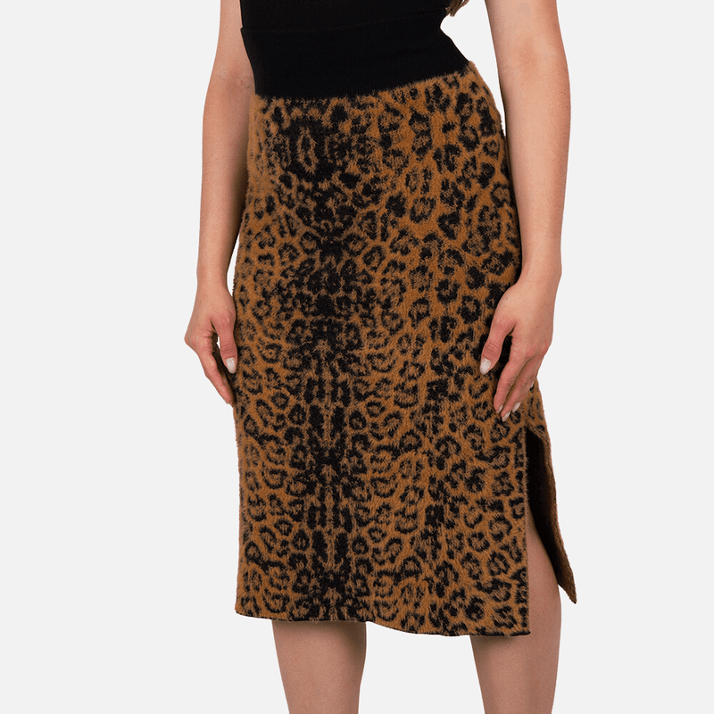 A saia-midi em tricô oferece um sofisticado caimento, valorizando a cintura alta marcada com o cós largo, em uma larga faixa preta. Modelando o corpo, além de realçar as manchas do pelo da onça sob o fundo canela do tricô cardado em tons terrosos.